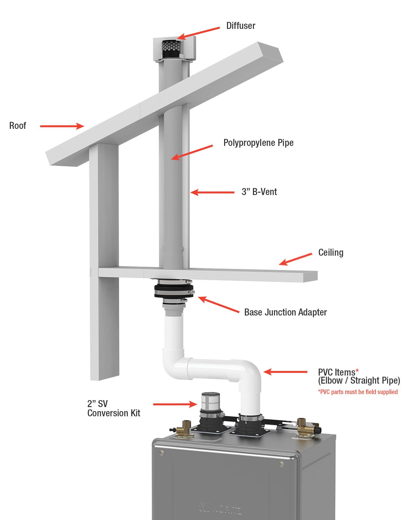 Noritz America maximizes ease of installation with its new No Roof Kit. With this accessory, premix burner Noritz tankless water heaters can be installed without the installer setting foot on the roof, offering time-, labor-, and cost-savings in residential applications. Not only does the No Roof Kit eliminate the contractor’s need to climb on the roof to install venting for the tankless water heater, but drilling holes in the wall for exhaust is also no longer needed. Best suited for single-story homes and attic installs, the No Roof Kit includes three, 36-inch polypropylene (PP) pipes and a PP-PVC adaptor, a 2-inch single vent (SV) conversion kit, and a diffuser kit. To use the kit, a pre-existing, 3- or 4-inch circular B-vent, no longer than 8.5 feet, with a straight vertical shot from the ceiling to the roof, is required.