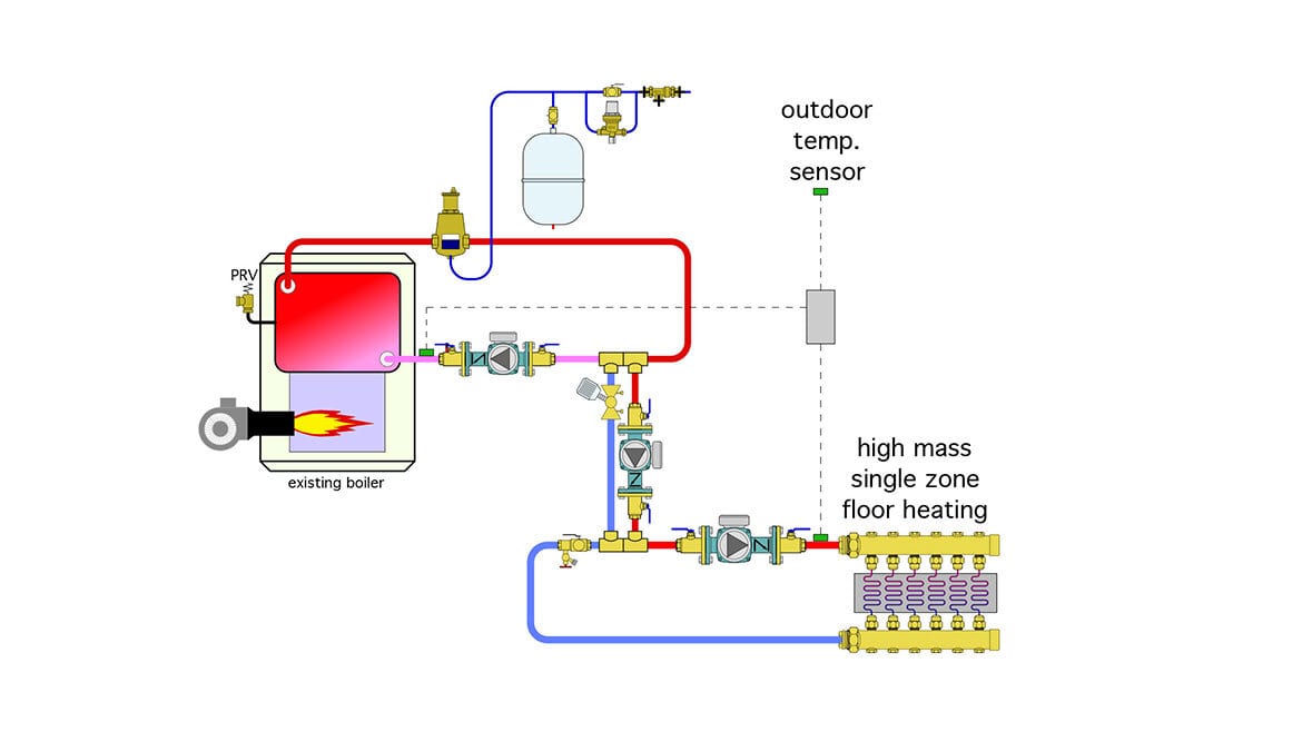 Figure 5 shows an existing system in which a conventional boiler supplies low-temperature radiant panel heating, using a variable-speed circulator for injection mixing. In North America, there are thousands of existing systems that have this or a similar configuration.