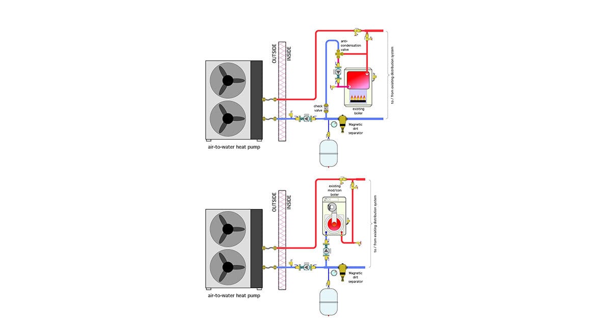 Figure 1 shows two piping configurations, one for a conventional boiler (e.g., a boiler not intended to operate with sustained flue gas condensation), and the other for a mod/con boiler. In each scenario, the air-to-water heat pump is connected in parallel with the boiler.
