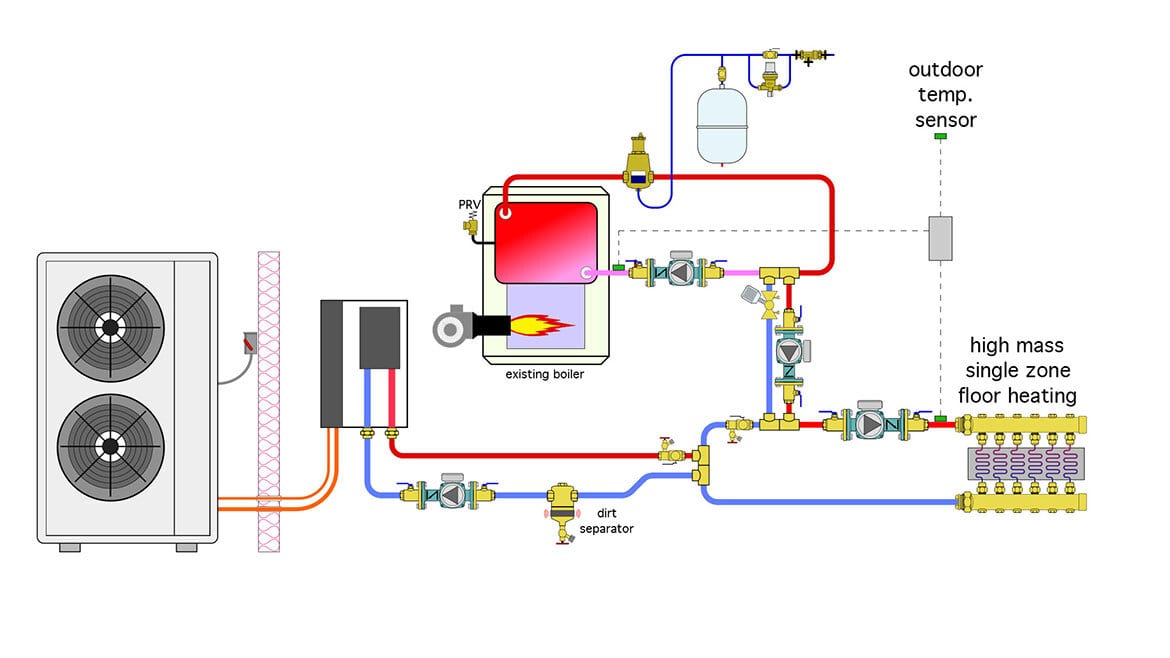 Options for connecting heat pumps to existing boiler systems.